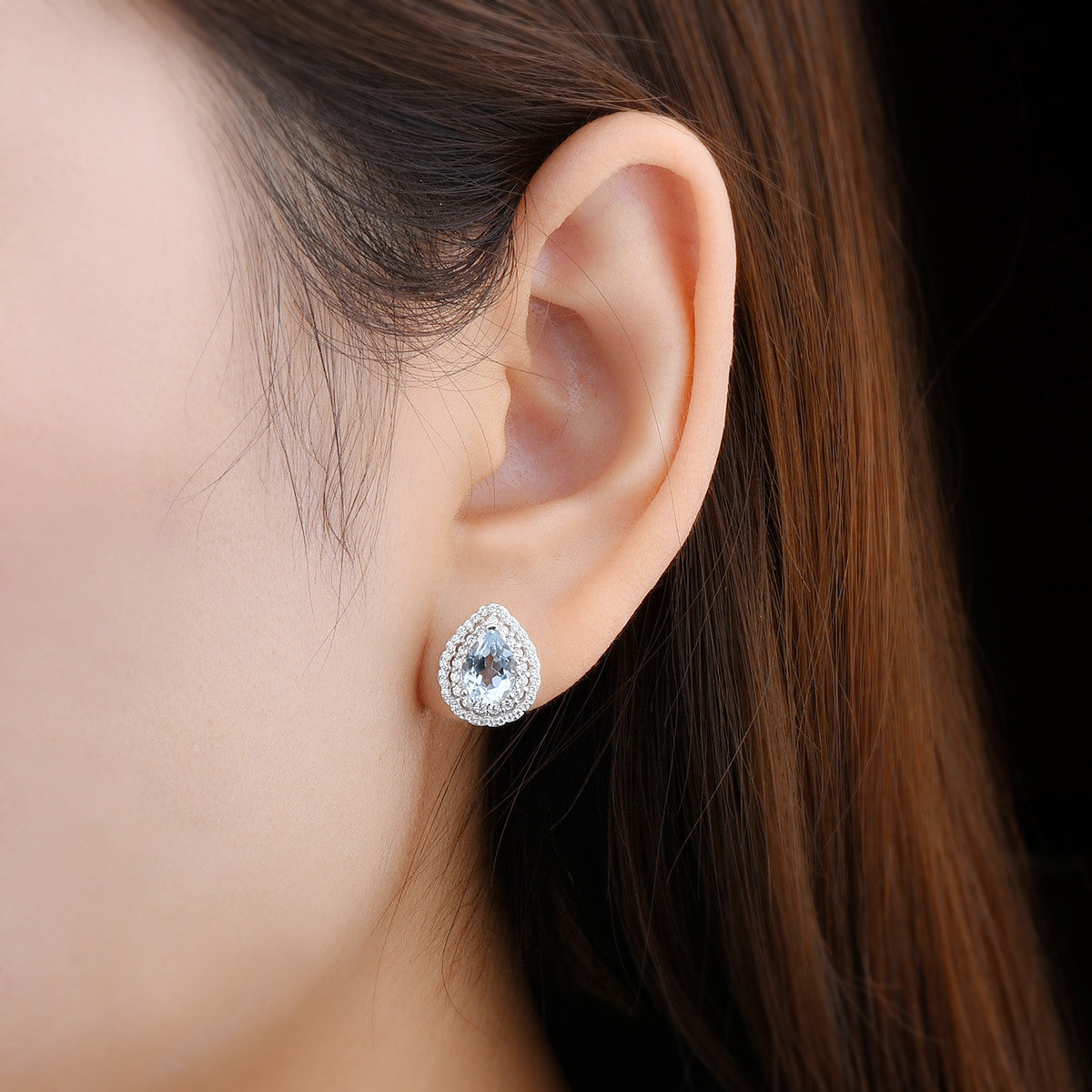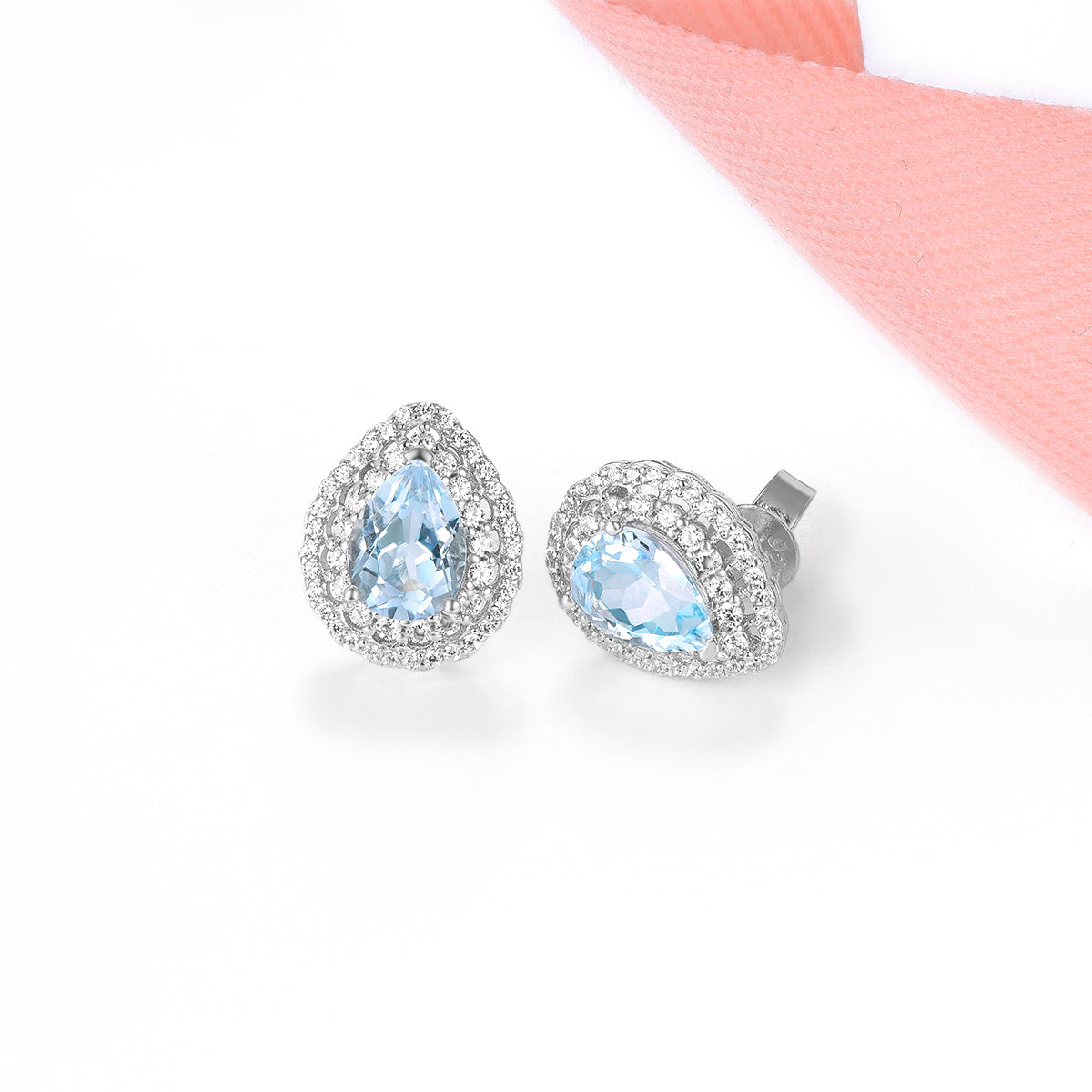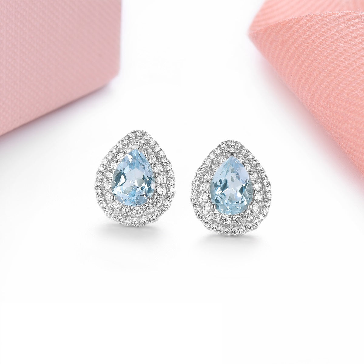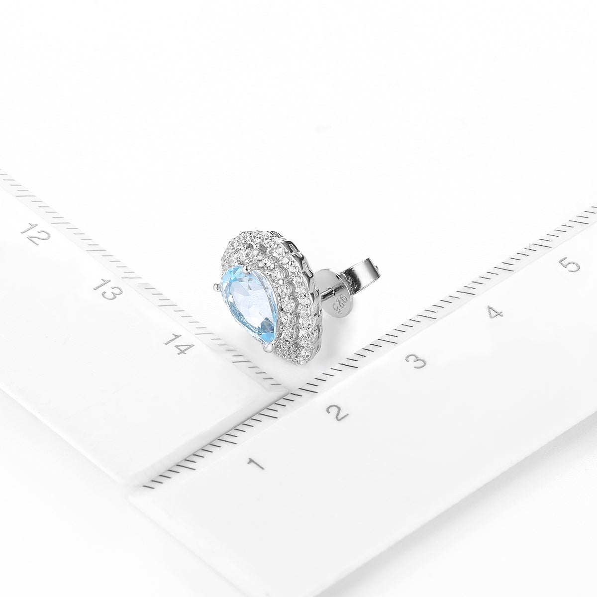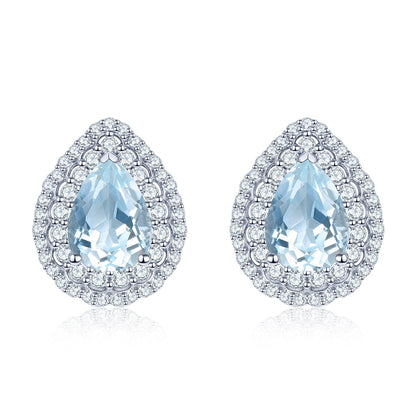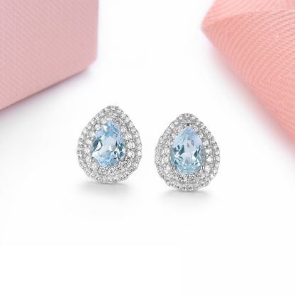 8x6mm Pear Cut Natural Blue Topaz Double Halo Stud Earrings