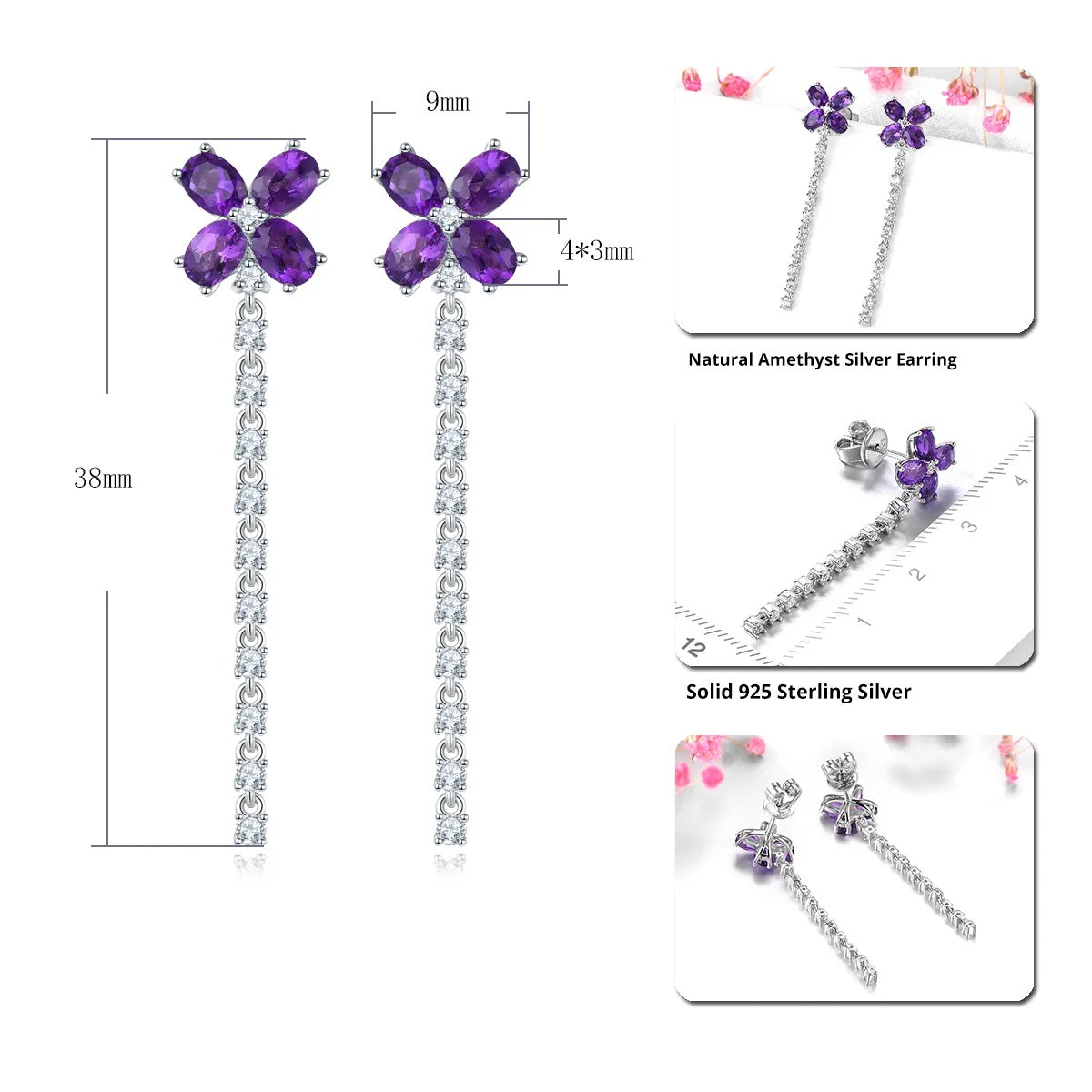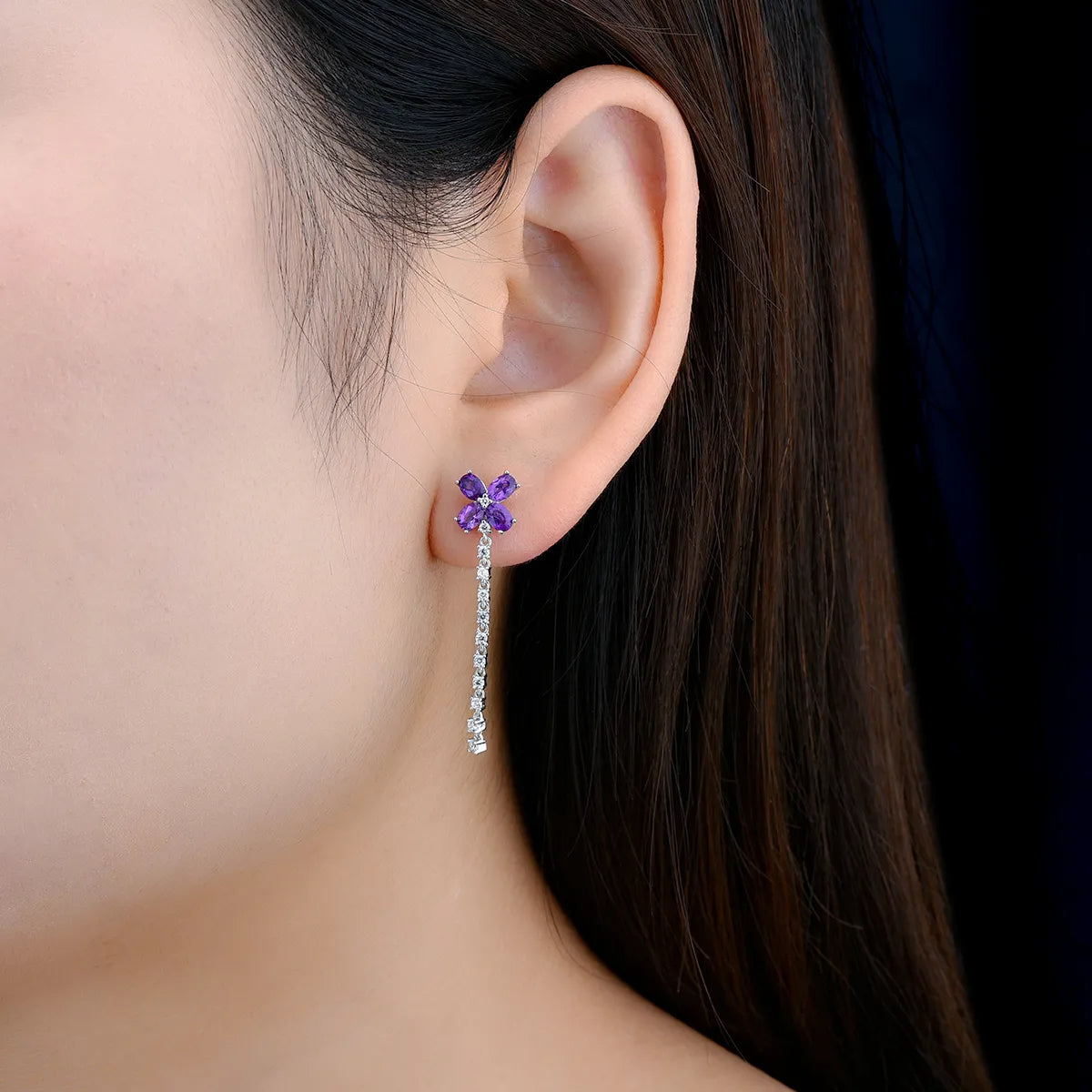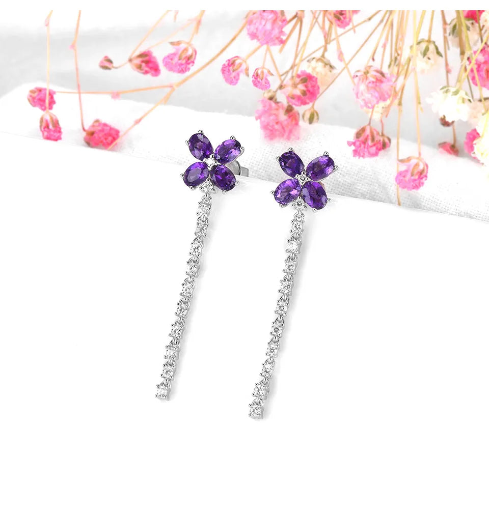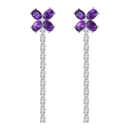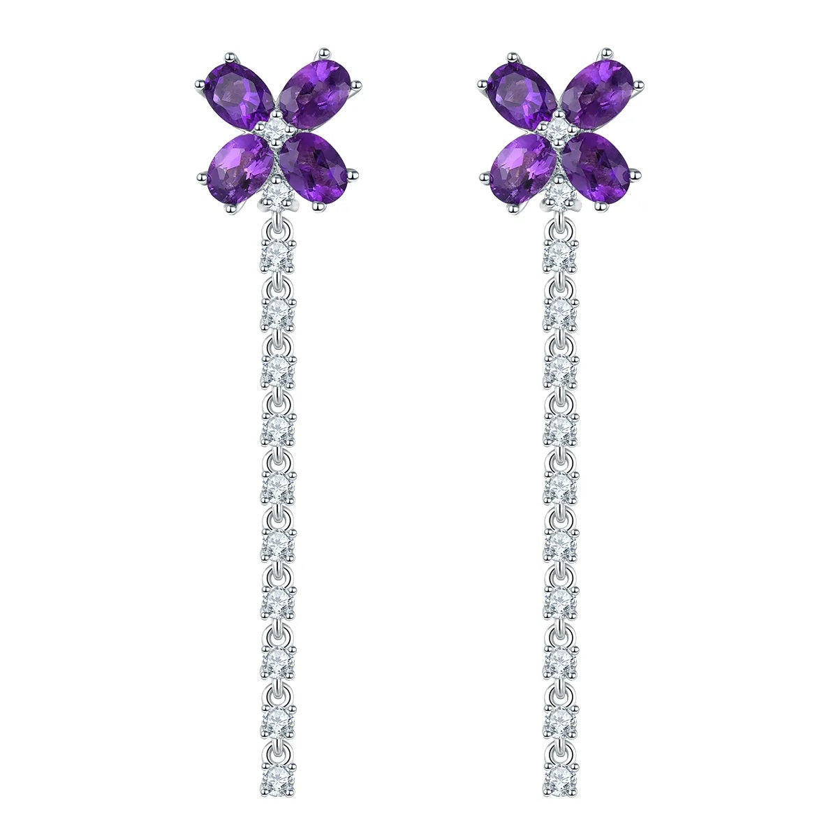 Indulge in luxury with our elegant Four Stone Dangle Earrings in 925 Sterling Silver. Featuring vibrant Oval Cut gemstones in a color palette of purple, green, and yellow, these earrings are perfect for any occasion!
