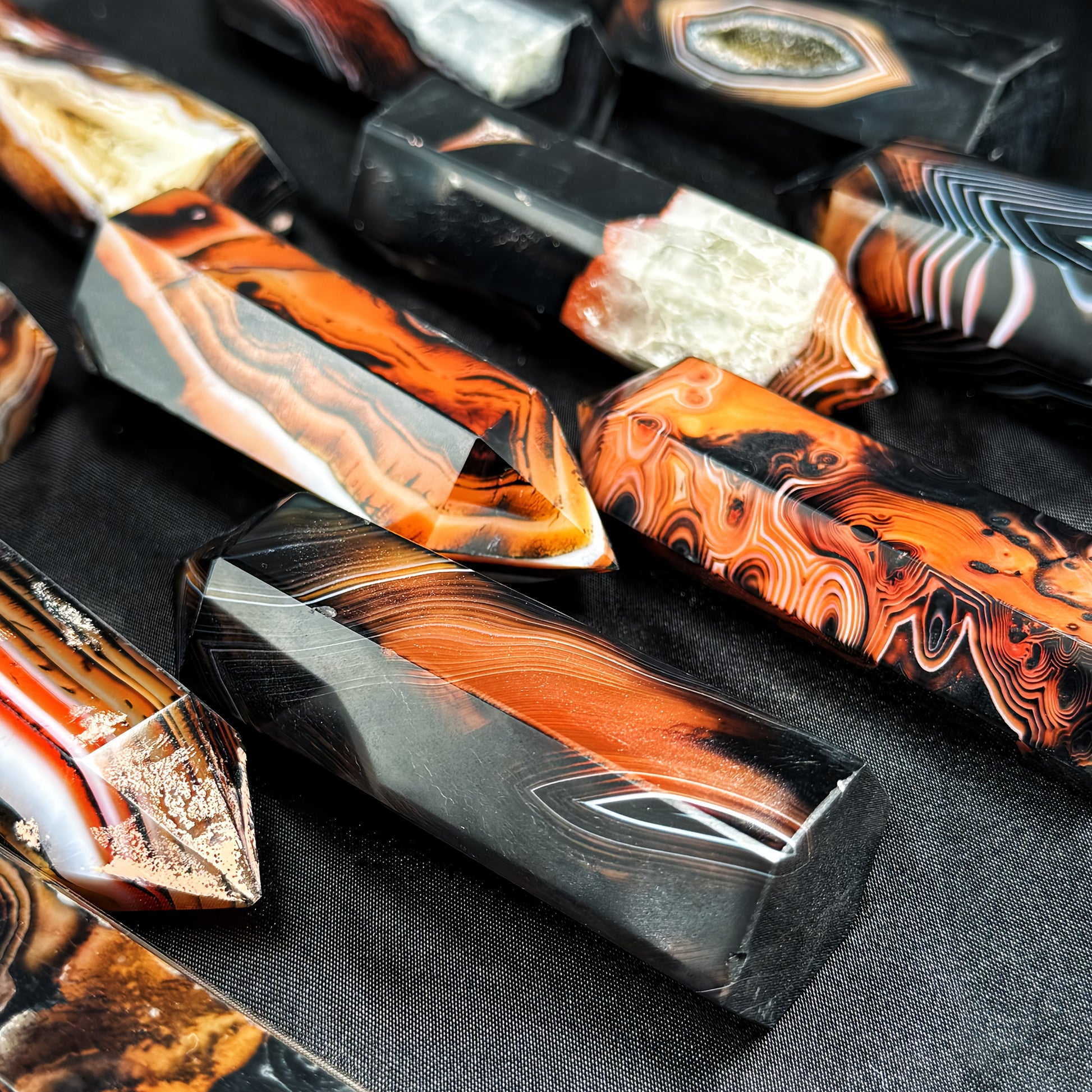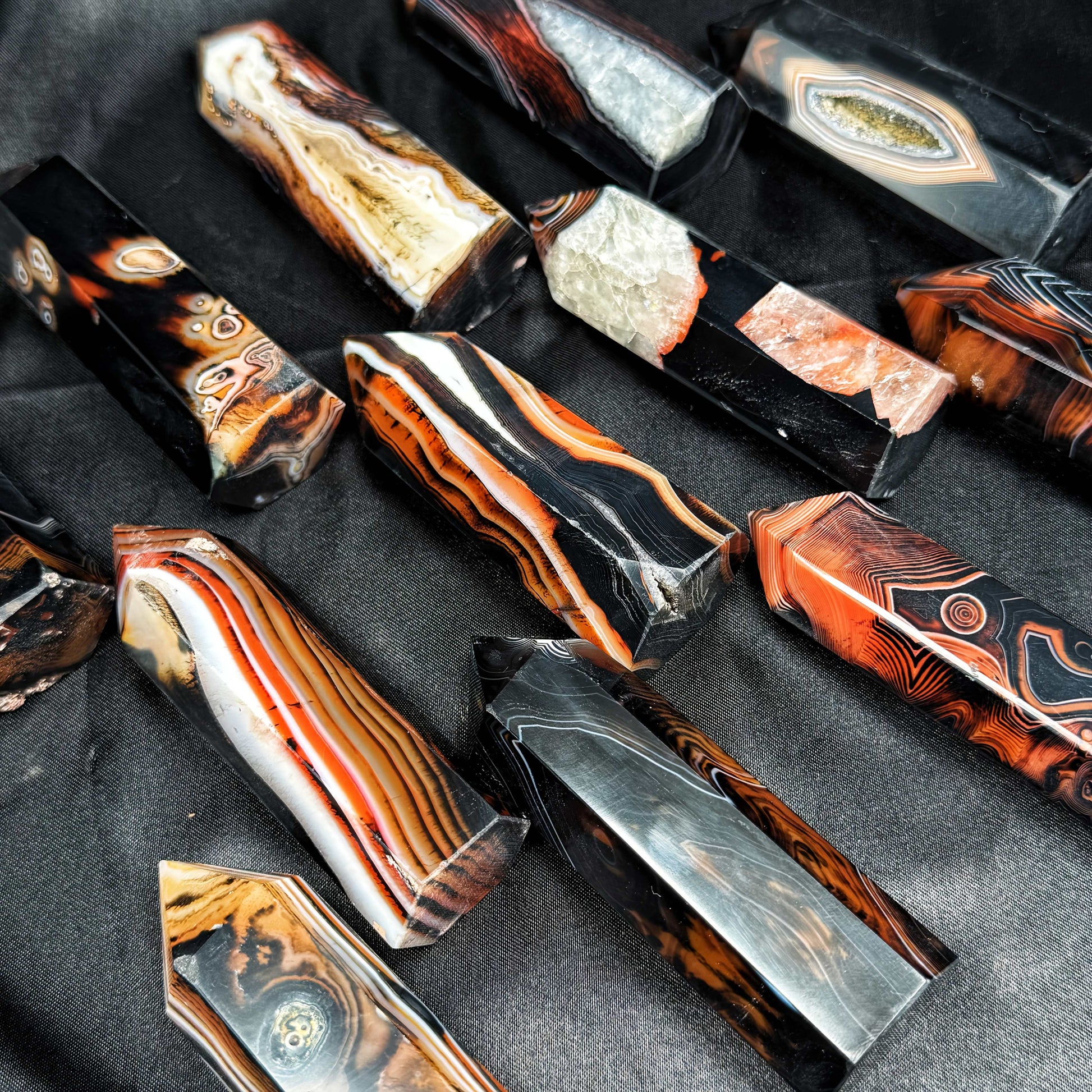 This agate pillar features dramatic swirls of deep red and black, symbolising strength, protection, and balance. Delicate natural crystal pockets add visual depth and shimmer, making it a captivating display piece for meditation spaces, altars, or modern home décor.