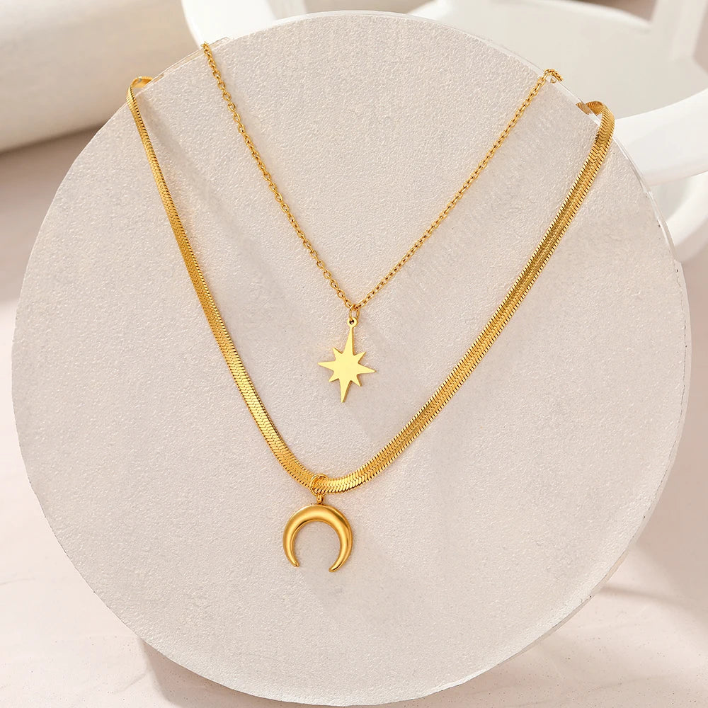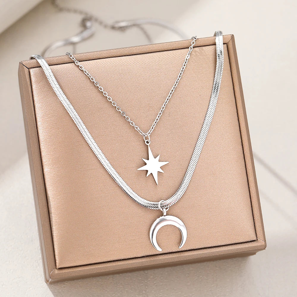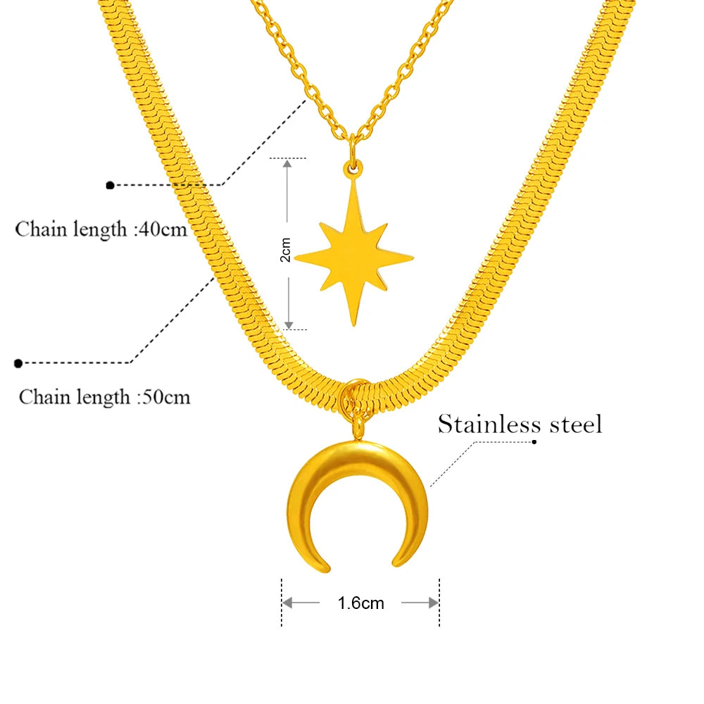 Colar com pingente de espinha de peixe em titânio lua e estrela